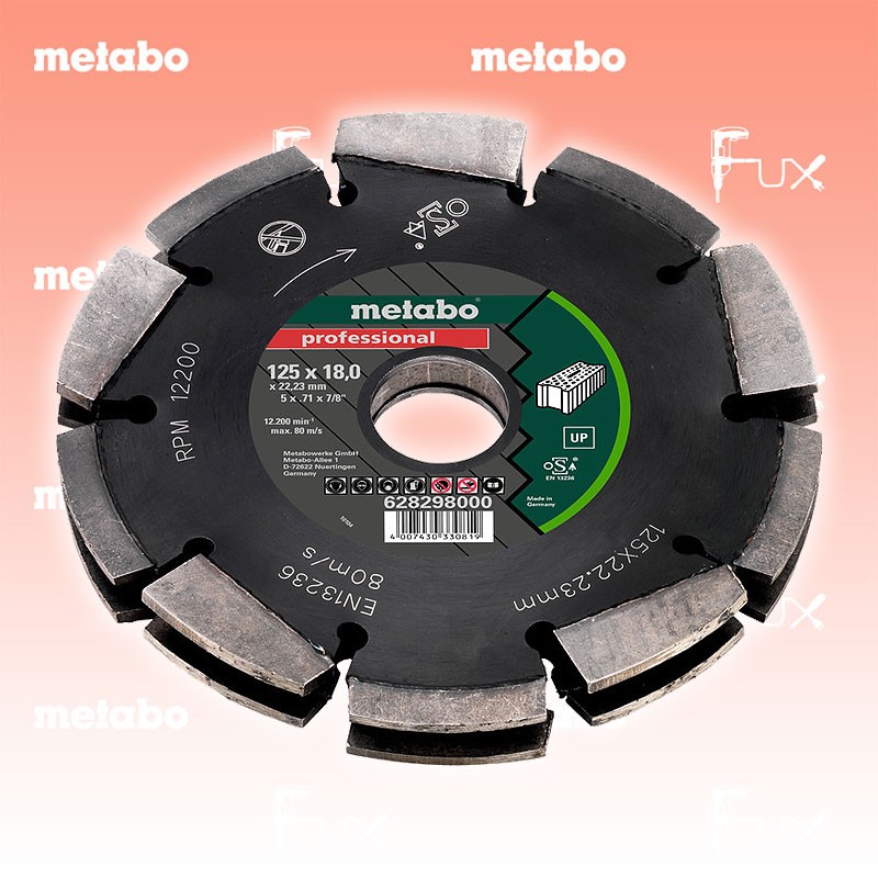 Zu "Mauernutfräse " von Metabo Metabo Dia-FS3, 125x18x22.23 mm "Professional" UP Bestell- und Artikelnummer: 628298000 Schnelles und komfortables Fräsen von Mauerschlitzen in vielfältigen Materialien möglich Hohe Arbeitserleichterung, durch das intelligente System aus verschränkt angeordneten Segmenten, da Herausstemmen des Mittelstegs entfällt. Hohe Zeitersparnis durch Fräsen in einem Arbeitsgang Reduzierung von Schmutz und Staub, da das Material sauber und vollständig aus dem Schlitz entfernt wird Passgenaue Schlitze für Einzelleitungen Ø 12 mm, oder für Ø 20 und 25 mm-Leerrohre. Max. Schnittbreite: 20 mm (2-reihig) bzw. 30 mm (3-reihig) Technische Daten Durchmesser x Bohrung 125 x 22.23 mm Segmentabmessungen 18 x 7 mm Segmentanzahl 20 Max. Drehzahl 12200 /min Standard-Ausrüstung Verkaufseinheit 1 Listenpreis CHF 208.00 Fuxpreis CHF 177.00 inklusive 8.1% MwSt Frankolieferung Kein Grauimport! Produkt bestellen Verkaufseinheit 1 1 Stück 2 Stück 3 Stück 4 Stück 5 Stück 6 Stück 7 Stück 8 Stück 9 Stück 10 Stück 11 Stück 12 Stück 13 Stück 14 Stück 15 Stück 16 Stück 17 Stück 18 Stück 19 Stück 20 Stück 21 Stück 22 Stück 23 Stück 24 Stück 25 Stück 26 Stück 27 Stück 28 Stück 29 Stück 30 Stück 31 Stück 32 Stück 33 Stück 34 Stück 35 Stück 36 Stück 37 Stück 38 Stück 39 Stück 40 Stück 41 Stück 42 Stück 43 Stück 44 Stück 45 Stück 46 Stück 47 Stück 48 Stück 49 Stück 50 Stück Alle Angaben ohne Gewähr und solange Vorrat reicht!Wiederverkäufer werden?Lehrlingsrabatt? Produkt als PDF AKTION 15%