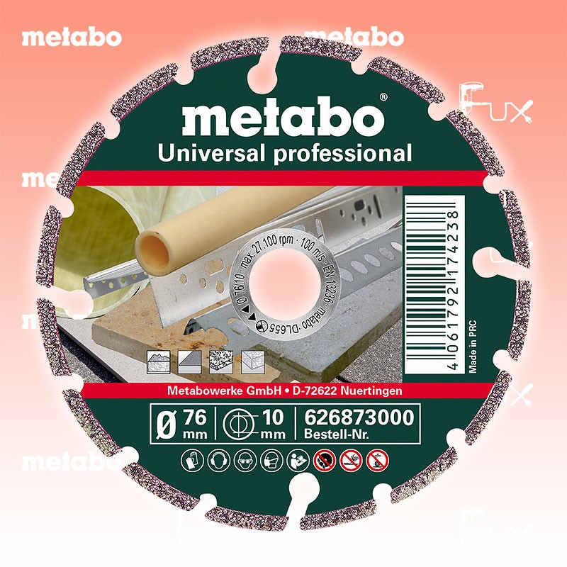 Zu "Winkelschleifer Universal Diamanttrennscheibe" von Metabo Metabo Winkelschleifer Universal Diamanttrennscheibe Bestell- und Artikelnummer: 626873000 Diamanttrennscheibe mit Vakuum-gelöteten Diamanten für den universellen Einsatz Sehr gute Schneideigenschaften, aufgrund eines hohen Diamantanteils Geeignet für eine Vielzahl von Materialien, wie Beton, Fliesen, Verbundwerkstoffe, Gipskarton, PVC, Bleche, Gewindestangen, dünnes Holz Technische Daten Durchmesser x Bohrung 76 x 10 mm Segmentabmessungen 12 x 1.2 x 2.2 mm Segmentanzahl 16 Max. Drehzahl 20100 /min Standard-Ausrüstung Verkaufseinheit 1 Stk. Listenpreis CHF 27.50 Fuxpreis CHF 23.00 inklusive 8.1% MwSt Versand CHF 15.00 Kein Grauimport! Produkt bestellen Verkaufseinheit 1 Stk. 1 Stück 2 Stück 3 Stück 4 Stück 5 Stück 6 Stück 7 Stück 8 Stück 9 Stück 10 Stück 11 Stück 12 Stück 13 Stück 14 Stück 15 Stück 16 Stück 17 Stück 18 Stück 19 Stück 20 Stück 21 Stück 22 Stück 23 Stück 24 Stück 25 Stück 26 Stück 27 Stück 28 Stück 29 Stück 30 Stück 31 Stück 32 Stück 33 Stück 34 Stück 35 Stück 36 Stück 37 Stück 38 Stück 39 Stück 40 Stück 41 Stück 42 Stück 43 Stück 44 Stück 45 Stück 46 Stück 47 Stück 48 Stück 49 Stück 50 Stück Alle Angaben ohne Gewähr und solange Vorrat reicht!Wiederverkäufer werden?Lehrlingsrabatt? Produkt als PDF AKTION 15%
