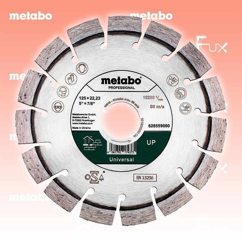 Zu "Qualitätsklasse »professional« / UP Universal " von Metabo Metabo Diamanttrennscheibe 125 mm Bestell- und Artikelnummer: 628559000 Bestens geeignet für alle allgemeinen Bau-/ und Baustellenmaterialien, wie Beton, Waschbeton, harte/ weiche Sandsteine, Tonziegel Die Universalscheibe mit der hochwertigen Diamantqualität und hochwertigen Rohstoffen für optimale Schnittleistung und hohe Standzeit Spezielle Kurzzahnsegmente für hohe Schnittfreudigkeit und saubere Schnittkanten Laserverschweißte Diamantsegmente; Segmenthöhe: 9 mm Technische Daten Durchmesser x Bohrung 125 x 22.23 mm Segmentabmessungen 20 x 2.4 x 9 mm Segmentanzahl 15 Max. Drehzahl 12200 /min Standard-Ausrüstung Verkaufseinheit 1 Stk. Listenpreis CHF 35.50 Fuxpreis CHF 30.00 inklusive 8.1% MwSt Versand CHF 15.00 Kein Grauimport! Produkt bestellen Verkaufseinheit 1 Stk. 1 Stück 2 Stück 3 Stück 4 Stück 5 Stück 6 Stück 7 Stück 8 Stück 9 Stück 10 Stück 11 Stück 12 Stück 13 Stück 14 Stück 15 Stück 16 Stück 17 Stück 18 Stück 19 Stück 20 Stück 21 Stück 22 Stück 23 Stück 24 Stück 25 Stück 26 Stück 27 Stück 28 Stück 29 Stück 30 Stück 31 Stück 32 Stück 33 Stück 34 Stück 35 Stück 36 Stück 37 Stück 38 Stück 39 Stück 40 Stück 41 Stück 42 Stück 43 Stück 44 Stück 45 Stück 46 Stück 47 Stück 48 Stück 49 Stück 50 Stück Alle Angaben ohne Gewähr und solange Vorrat reicht!Wiederverkäufer werden?Lehrlingsrabatt? Produkt als PDF AKTION 15%