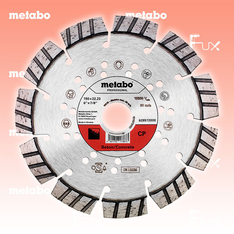 Zu "Qualitätsklasse »professional« / CP " von Metabo Metabo Diamanttrennscheibe 150 mm Bestell- und Artikelnummer: 628572000 Ideal für alle harten Materialien, wie Beton (auch armiert), Betonrohre, Bordsteine, harte Sandsteine, Verbundsteine, Waschbeton Hochwertige Diamantqualität und hochwertige Rohstoffe für optimale Schnittleistung und hohe Standzeit Spezielle Turbosegmente für sehr hohe Schnittgeschwindigkeit in nahezu allen Materialien Laserverschweißte Diamantsegmente; Segmenthöhe: 12 mm Technische Daten Durchmesser x Bohrung 150 x 22.23 mm Segmentabmessungen 33 x 2,4 x 12 Segmentanzahl 10 Max. Drehzahl 10200 /min Standard-Ausrüstung Verkaufseinheit 1 Stk. Listenpreis CHF 64.00 Fuxpreis CHF 54.00 inklusive 8.1% MwSt Versand CHF 15.00 Kein Grauimport! Produkt bestellen Verkaufseinheit 1 Stk. 1 Stück 2 Stück 3 Stück 4 Stück 5 Stück 6 Stück 7 Stück 8 Stück 9 Stück 10 Stück 11 Stück 12 Stück 13 Stück 14 Stück 15 Stück 16 Stück 17 Stück 18 Stück 19 Stück 20 Stück 21 Stück 22 Stück 23 Stück 24 Stück 25 Stück 26 Stück 27 Stück 28 Stück 29 Stück 30 Stück 31 Stück 32 Stück 33 Stück 34 Stück 35 Stück 36 Stück 37 Stück 38 Stück 39 Stück 40 Stück 41 Stück 42 Stück 43 Stück 44 Stück 45 Stück 46 Stück 47 Stück 48 Stück 49 Stück 50 Stück Alle Angaben ohne Gewähr und solange Vorrat reicht!Wiederverkäufer werden?Lehrlingsrabatt? Produkt als PDF AKTION 15%