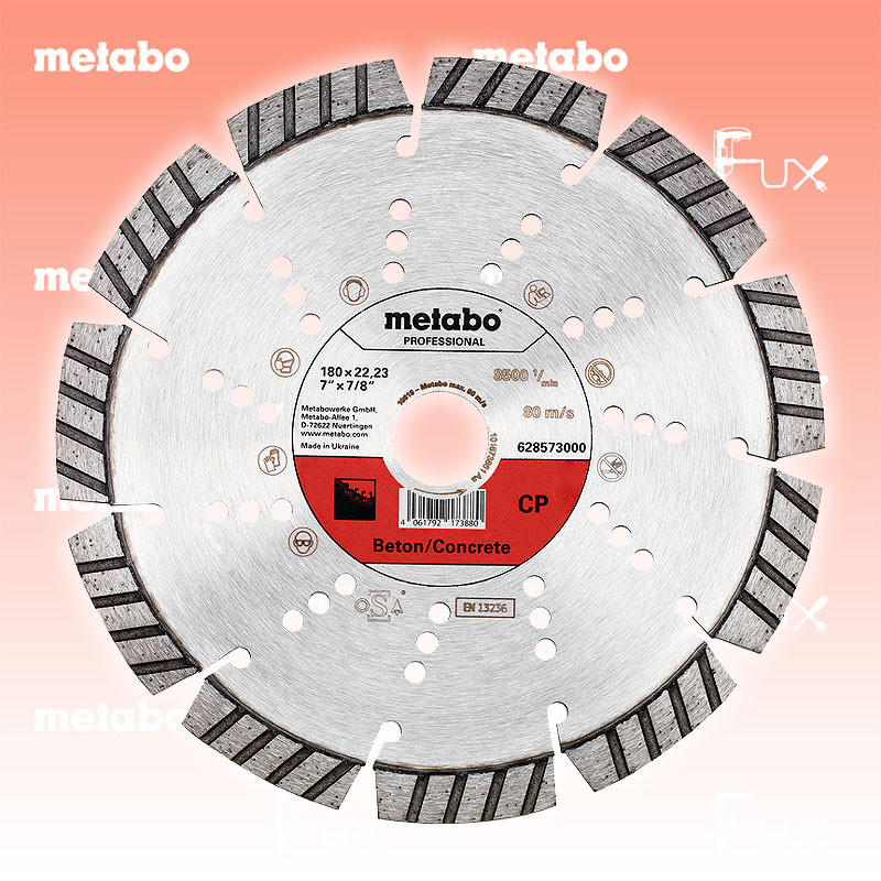 Zu "Qualitätsklasse »professional« / CP " von Metabo Metabo Diamanttrennscheibe 180 mm Bestell- und Artikelnummer: 628573000 Ideal für alle harten Materialien, wie Beton (auch armiert), Betonrohre, Bordsteine, harte Sandsteine, Verbundsteine, Waschbeton Hochwertige Diamantqualität und hochwertige Rohstoffe für optimale Schnittleistung und hohe Standzeit Spezielle Turbosegmente für sehr hohe Schnittgeschwindigkeit in nahezu allen Materialien Laserverschweißte Diamantsegmente; Segmenthöhe: 12 mm Technische Daten Durchmesser x Bohrung 180 x 22.23 mm Segmentabmessungen 42 x 2,6 x 12 Segmentanzahl 11 Max. Drehzahl 8500 /min Standard-Ausrüstung Verkaufseinheit 1 Stk. Listenpreis CHF 76.00 Fuxpreis CHF 65.00 inklusive 8.1% MwSt Versand CHF 15.00 Kein Grauimport! Produkt bestellen Verkaufseinheit 1 Stk. 1 Stück 2 Stück 3 Stück 4 Stück 5 Stück 6 Stück 7 Stück 8 Stück 9 Stück 10 Stück 11 Stück 12 Stück 13 Stück 14 Stück 15 Stück 16 Stück 17 Stück 18 Stück 19 Stück 20 Stück 21 Stück 22 Stück 23 Stück 24 Stück 25 Stück 26 Stück 27 Stück 28 Stück 29 Stück 30 Stück 31 Stück 32 Stück 33 Stück 34 Stück 35 Stück 36 Stück 37 Stück 38 Stück 39 Stück 40 Stück 41 Stück 42 Stück 43 Stück 44 Stück 45 Stück 46 Stück 47 Stück 48 Stück 49 Stück 50 Stück Alle Angaben ohne Gewähr und solange Vorrat reicht!Wiederverkäufer werden?Lehrlingsrabatt? Produkt als PDF AKTION 15%