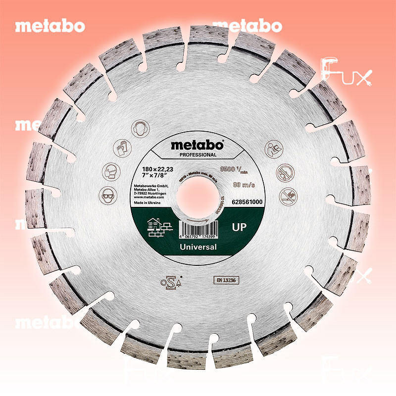 Zu "Qualitätsklasse »professional« / UP Universal " von Metabo Metabo Diamanttrennscheibe 180 mm Bestell- und Artikelnummer: 628561000 Bestens geeignet für alle allgemeinen Bau-/ und Baustellenmaterialien, wie Beton, Waschbeton, harte/ weiche Sandsteine, Tonziegel Die Universalscheibe mit der hochwertigen Diamantqualität und hochwertigen Rohstoffen für optimale Schnittleistung und hohe Standzeit Spezielle Kurzzahnsegmente für hohe Schnittfreudigkeit und saubere Schnittkanten Laserverschweißte Diamantsegmente; Segmenthöhe: 9 mm Technische Daten Durchmesser x Bohrung 180 x 22.23 mm Segmentabmessungen 20 x 2.6 x 9 mm Segmentanzahl 22 Max. Drehzahl 8500 /min Standard-Ausrüstung Verkaufseinheit 1 Stk. Listenpreis CHF 54.00 Fuxpreis CHF 46.00 inklusive 8.1% MwSt Versand CHF 15.00 Kein Grauimport! Produkt bestellen Verkaufseinheit 1 Stk. 1 Stück 2 Stück 3 Stück 4 Stück 5 Stück 6 Stück 7 Stück 8 Stück 9 Stück 10 Stück 11 Stück 12 Stück 13 Stück 14 Stück 15 Stück 16 Stück 17 Stück 18 Stück 19 Stück 20 Stück 21 Stück 22 Stück 23 Stück 24 Stück 25 Stück 26 Stück 27 Stück 28 Stück 29 Stück 30 Stück 31 Stück 32 Stück 33 Stück 34 Stück 35 Stück 36 Stück 37 Stück 38 Stück 39 Stück 40 Stück 41 Stück 42 Stück 43 Stück 44 Stück 45 Stück 46 Stück 47 Stück 48 Stück 49 Stück 50 Stück Alle Angaben ohne Gewähr und solange Vorrat reicht!Wiederverkäufer werden?Lehrlingsrabatt? Produkt als PDF AKTION 15%