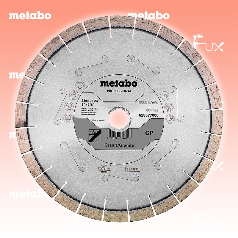 Zu "Qualitätsklasse »professional« / GP" von Metabo Metabo Diamanttrennscheibe 230 mm Bestell- und Artikelnummer: 628577000 Ideal für alle Granitarten, Terrazzzo-Platten Hochwertige Diamantqualität und hochwertige Rohstoffe für optimale Schnittleistung und hohe Standzeit Laserverschweißte Diamantsegmente; Segmenthöhe: 12 mm Technische Daten Durchmesser x Bohrung 230 x 22.23 mm Segmentabmessungen 20 x 2.6 x 9 mm Segmentanzahl 30 Max. Drehzahl 6600 /min Standard-Ausrüstung Verkaufseinheit 1 Stk. Listenpreis CHF 123.00 Fuxpreis CHF 105.00 inklusive 8.1% MwSt Frankolieferung Kein Grauimport! Produkt bestellen Verkaufseinheit 1 Stk. 1 Stück 2 Stück 3 Stück 4 Stück 5 Stück 6 Stück 7 Stück 8 Stück 9 Stück 10 Stück 11 Stück 12 Stück 13 Stück 14 Stück 15 Stück 16 Stück 17 Stück 18 Stück 19 Stück 20 Stück 21 Stück 22 Stück 23 Stück 24 Stück 25 Stück 26 Stück 27 Stück 28 Stück 29 Stück 30 Stück 31 Stück 32 Stück 33 Stück 34 Stück 35 Stück 36 Stück 37 Stück 38 Stück 39 Stück 40 Stück 41 Stück 42 Stück 43 Stück 44 Stück 45 Stück 46 Stück 47 Stück 48 Stück 49 Stück 50 Stück Alle Angaben ohne Gewähr und solange Vorrat reicht!Wiederverkäufer werden?Lehrlingsrabatt? Produkt als PDF AKTION 15%