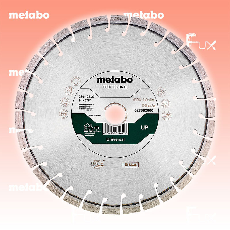 Zu "Qualitätsklasse »professional« / UP Universal " von Metabo Metabo Diamanttrennscheibe 350 mm Bestell- und Artikelnummer: 628564000 Bestens geeignet für alle allgemeinen Bau-/ und Baustellenmaterialien, wie Beton, Waschbeton, harte/ weiche Sandsteine, Tonziegel Die Universalscheibe mit der hochwertigen Diamantqualität und hochwertigen Rohstoffen für optimale Schnittleistung und hohe Standzeit Spezielle Kurzzahnsegmente für hohe Schnittfreudigkeit und saubere Schnittkanten Laserverschweißte Diamantsegmente; Segmenthöhe: 9 mm Technische Daten Durchmesser x Bohrung 350 x 22.23 mm Segmentabmessungen 24 x 2.8 x 10 mm Segmentanzahl 22 Max. Drehzahl 5400 /min Standard-Ausrüstung Verkaufseinheit 1 Stk. Listenpreis CHF 143.00 Fuxpreis CHF 122.00 inklusive 8.1% MwSt Frankolieferung Kein Grauimport! Produkt bestellen Verkaufseinheit 1 Stk. 1 Stück 2 Stück 3 Stück 4 Stück 5 Stück 6 Stück 7 Stück 8 Stück 9 Stück 10 Stück 11 Stück 12 Stück 13 Stück 14 Stück 15 Stück 16 Stück 17 Stück 18 Stück 19 Stück 20 Stück 21 Stück 22 Stück 23 Stück 24 Stück 25 Stück 26 Stück 27 Stück 28 Stück 29 Stück 30 Stück 31 Stück 32 Stück 33 Stück 34 Stück 35 Stück 36 Stück 37 Stück 38 Stück 39 Stück 40 Stück 41 Stück 42 Stück 43 Stück 44 Stück 45 Stück 46 Stück 47 Stück 48 Stück 49 Stück 50 Stück Alle Angaben ohne Gewähr und solange Vorrat reicht!Wiederverkäufer werden?Lehrlingsrabatt? Produkt als PDF AKTION 15%