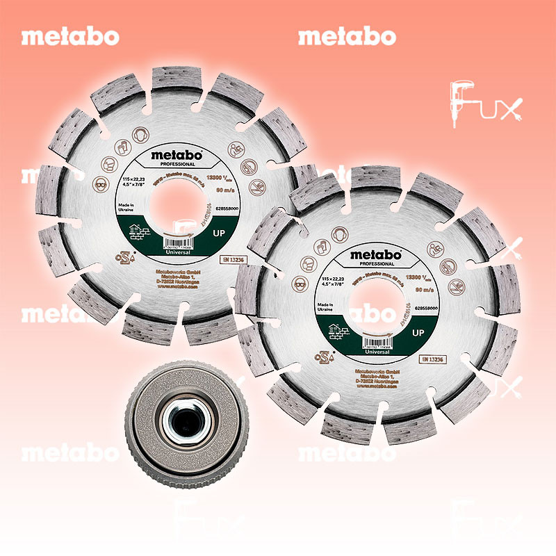 Zu "Diamanttrennscheiben SET "UP"" von Metabo Metabo Diamanttrennscheibe 115 mm Bestell- und Artikelnummer: 628581000 Bestens geeignet für alle allgemeinen Bau-/ und Baustellenmaterialien, wie Beton, Waschbeton, harte/ weiche Sandsteine, Tonziegel Die Universalscheibe mit der hochwertigen Diamantqualität und hochwertigen Rohstoffen für optimale Schnittleistung und hohe Standzeit Spezielle Kurzzahnsegmente für hohe Schnittfreudigkeit und saubere Schnittkanten Laserverschweißte Diamantsegmente; Segmenthöhe: 9 mm Technische Daten Durchmesser x Bohrung 115 x 22.23 mm Segmentabmessungen 20 x 2.4 x 9 mm Segmentanzahl 13 Max. Drehzahl 13300 /min Standard-Ausrüstung Verkaufseinheit 2 Stk. Quickspannmutter M14 Listenpreis CHF 62.00 Fuxpreis CHF 53.00 inklusive 8.1% MwSt Versand CHF 15.00 Kein Grauimport! Produkt bestellen Verkaufseinheit 2 Stk. Quickspannmutter M14 1 Stück 2 Stück 3 Stück 4 Stück 5 Stück 6 Stück 7 Stück 8 Stück 9 Stück 10 Stück 11 Stück 12 Stück 13 Stück 14 Stück 15 Stück 16 Stück 17 Stück 18 Stück 19 Stück 20 Stück 21 Stück 22 Stück 23 Stück 24 Stück 25 Stück 26 Stück 27 Stück 28 Stück 29 Stück 30 Stück 31 Stück 32 Stück 33 Stück 34 Stück 35 Stück 36 Stück 37 Stück 38 Stück 39 Stück 40 Stück 41 Stück 42 Stück 43 Stück 44 Stück 45 Stück 46 Stück 47 Stück 48 Stück 49 Stück 50 Stück Alle Angaben ohne Gewähr und solange Vorrat reicht!Wiederverkäufer werden?Lehrlingsrabatt? Produkt als PDF AKTION 15%