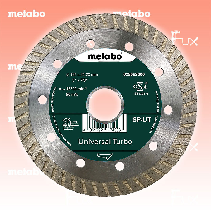 Zu "Qualitätsklasse »Universal« Turbo "SP"" von Metabo Metabo Diamanttrennscheibe 125 mm Bestell- und Artikelnummer: 628552000 Gut geeignet für alle Bau-/ und Baustellenmaterialien, wie Beton, Waschbeton, harte Sandsteine, Tonziegel Der umlaufende, geschlossene Schneidrand sorgt für saubere Schnittkanten ohne Materialausbrüche Gute Schnittleistung und optimale Standzeit Gesinterter Schneidrand, Segmenthöhe: 10 mm Technische Daten Durchmesser x Bohrung 125 x 22.23 mm Segmentabmessungen 2.2 x 10 mm Max. Drehzahl 12200 /min Standard-Ausrüstung Verkaufseinheit 1 Stk. Listenpreis CHF 14.50 Fuxpreis CHF 12.30 inklusive 8.1% MwSt Versand CHF 15.00 Kein Grauimport! Produkt bestellen Verkaufseinheit 1 Stk. 1 Stück 2 Stück 3 Stück 4 Stück 5 Stück 6 Stück 7 Stück 8 Stück 9 Stück 10 Stück 11 Stück 12 Stück 13 Stück 14 Stück 15 Stück 16 Stück 17 Stück 18 Stück 19 Stück 20 Stück 21 Stück 22 Stück 23 Stück 24 Stück 25 Stück 26 Stück 27 Stück 28 Stück 29 Stück 30 Stück 31 Stück 32 Stück 33 Stück 34 Stück 35 Stück 36 Stück 37 Stück 38 Stück 39 Stück 40 Stück 41 Stück 42 Stück 43 Stück 44 Stück 45 Stück 46 Stück 47 Stück 48 Stück 49 Stück 50 Stück Alle Angaben ohne Gewähr und solange Vorrat reicht!Wiederverkäufer werden?Lehrlingsrabatt? Produkt als PDF AKTION 15%