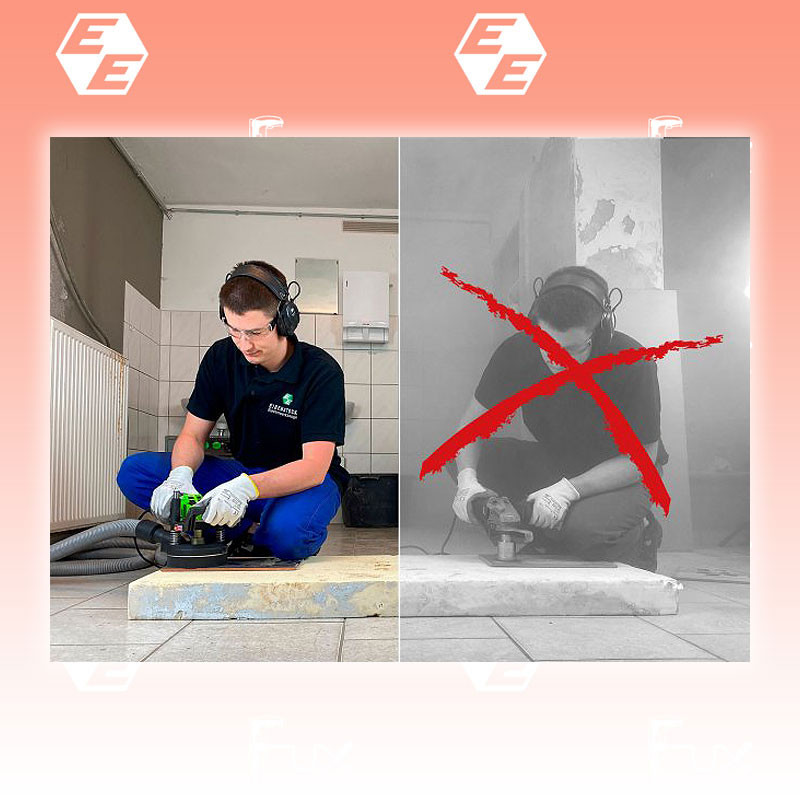 - Bester Schutz des Anwenders vor gefährlichen mineralischen Stäuben durch Absaugung, im Vergleich zu herkömmlichen Methoden mit Winkelschleifer