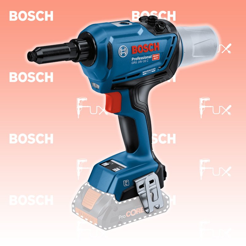 Die GRG 18V-16 C Professional befestigt verschiedenste Blindnieten (3.0 bis 6.4 mm Durchmesser) mit einer konstanten Zugkraft von 16'000 N. Diese Nietpistole bietet zwei Betriebsarten: AUTO für einen automatischen Nietvorgang und MANUAL für eine individuelle Steuerung des Arbeitsablaufs. Die integrierte Bluetooth Connectivity erlaubt es dem Anwender, den Wartungsplan für sein Werkzeug über die Bosch Toolbox App individuell festzulegen und zu verfolgen.