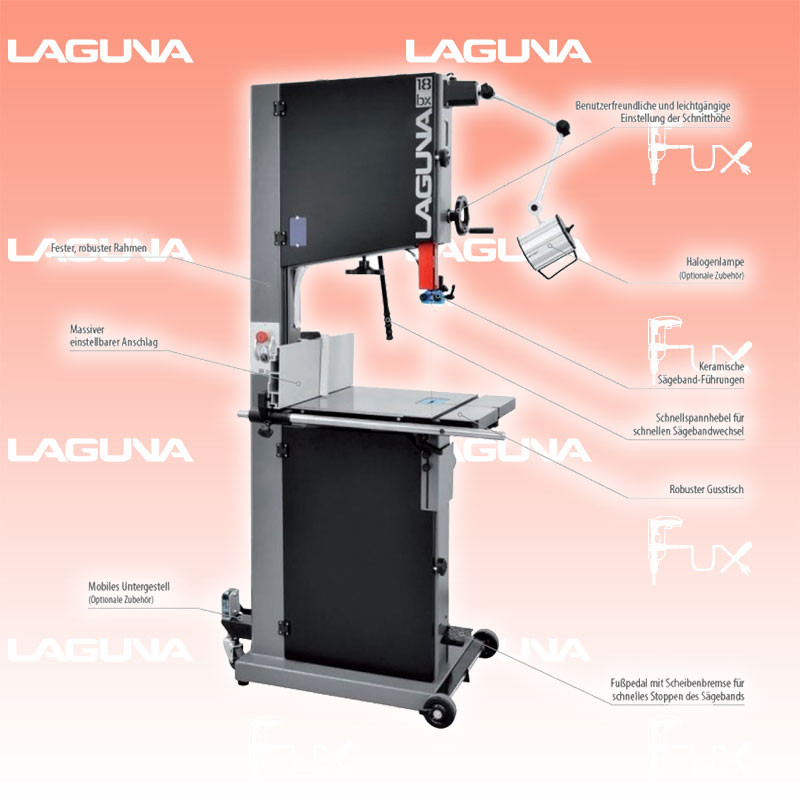 Zu "Holzbandsäge" von Laguna Laguna Holzbandsäge 18BX - 151-18BX Bestell- und Artikelnummer: 151-18BX Robuste Bandsäge für die professionelle Holzbearbeitung mit praktischer Schnitthöhe und dem stärksten Motor der Laguna-Serie Die Bandsäge IGM Laguna 18bx verfügt über einen schweren, robusten Rahmen mit einem leistungsstarken 2,2-kW-Motor. Die geschliffene Aluguss-Arbeitsplatte 500 x 660 mm bietet Stabilität auch bei übergrossen Werkstücken. Der Tisch ist zudem von -6° bis +45° neigbar. Der massive Parallelanschlag ist leicht verstellbar und kann in zwei Positionen (vertikal und horizontal) installiert werden. Die robusten Leichtmetallräder sind über das ganze Rad mit einem Polyurethan-Riemen ausgestattet. Der Riemen ist hitzebeständig und hat eine längere Lebensdauer als herkömmliche Gummiriemen. Das Schneckenrad und das Ritzel am Blattschutz sind ultra-glatt und so konstruiert, dass sie selbst bei vollständiger Ausladung nur minimalen Flex haben. Durch Drücken des Fusspedals wird erstens die Stromzufuhr zum Motor unterbrochen und zweitens die Scheibenbremse aktiviert, um die Säge praktisch sofort zum Stillstand zu bringen. Ausgestattet mit keramischem Führungssystem oberhalb und unterhalb der Arbeitsplatte. Keramikführungen führen das Sägeband präzise und gewährleisten gleichzeitig eine optimale Schnittqualität und verlängern die Lebensdauer Ihres Riemens. Sichtfenster ermöglichen es Ihnen, sowohl die Spannung als auch die Laufrichtung zu überprüfen, während die Maschine läuft. Ein Hebel auf der Rückseite der Säge ermöglicht ein schnelles Spannen und Lösen des Riemens. Die IGM Laguna 18bx hebt sich von anderen Maschinen besonders durch ihr cleveres Design ab, das Schnitte bis zu 463 mm ermöglicht Technische Eigenschaften: Starker 2200W Asynchronmotor Robuster Rahmen Schnelles Stoppen der Bandsäge durch Fusspedal mit Scheibenbremse. Schnellspannhebel für schnellen Sägebandwechsel Keramikführungen. Ausgewuchtete Gusseisenräder. Starker robuster Rahmen. Präzise und stufenlose Höhenverstellung bis 463 mm. Massiver verstellbarer Parallelanschlag. Tischneigung -6° bis + 45°. Radbürste absenken. Kann mit einem praktischen mobilen Ständer ausgestattet werden. Technische Daten Typ: Laguna 18bx Klassifizierung: Professional Elektrischer Anschluss: 400 V Aufnahmeleistung: 2200 W Arbeitsplatte: 508 x 660 mm Sägeblatt-Länge: 3695 mm Sägeblatt-Breite: 3 - 31 mm Geschwindigkeit: 965 m/min Schnitthöhe: 463 mm max. Schnittbreite mit Anschlag: 400 mm max. Schnittbreite ohne Anschlag: 460 mm Tischneigung: -6° bis +45° Absaugstutzen-∅ am Gerät: 100 mm Länge x Breite x Höhe: 759 x 919 x 1975 mm Gewicht: 186 kg Verpackungsmaße: 2070 mm x 650 mm x 850 mm Versandgewicht: 210 kg Die Bandsäge ist mit allen CE-erforderlichen Sicherheitsfunktionen ausgestattet. Standard-Ausrüstung Holzbandsäge 18BX Parallelanschlag Bandsägeblatt IGM Carbon FORCE HOOK - 16 x 0,8 mm 4TPi Wird teilmontiert in einer Transportkiste geliefert. Die Aufbauzeit beträgt ca. 1 Stunde. Für die Benützung dieses Produkts wird möglicherweise ein Stromadapter benötigt. Sollte dies der Fall sein, ist dieser Adapter entweder bereits verbaut oder wird mitgeliefert. Zubehör Listenpreis CHF 2'964.00 Fuxpreis CHF 2'816.00 inklusive 8.1% MwSt Versand CHF 15.00 Kein Grauimport! Produkt bestellen 1 Stück 2 Stück 3 Stück 4 Stück 5 Stück 6 Stück 7 Stück 8 Stück 9 Stück 10 Stück Alle Angaben ohne Gewähr und solange Vorrat reicht! Produkt als PDF AKTION 5%