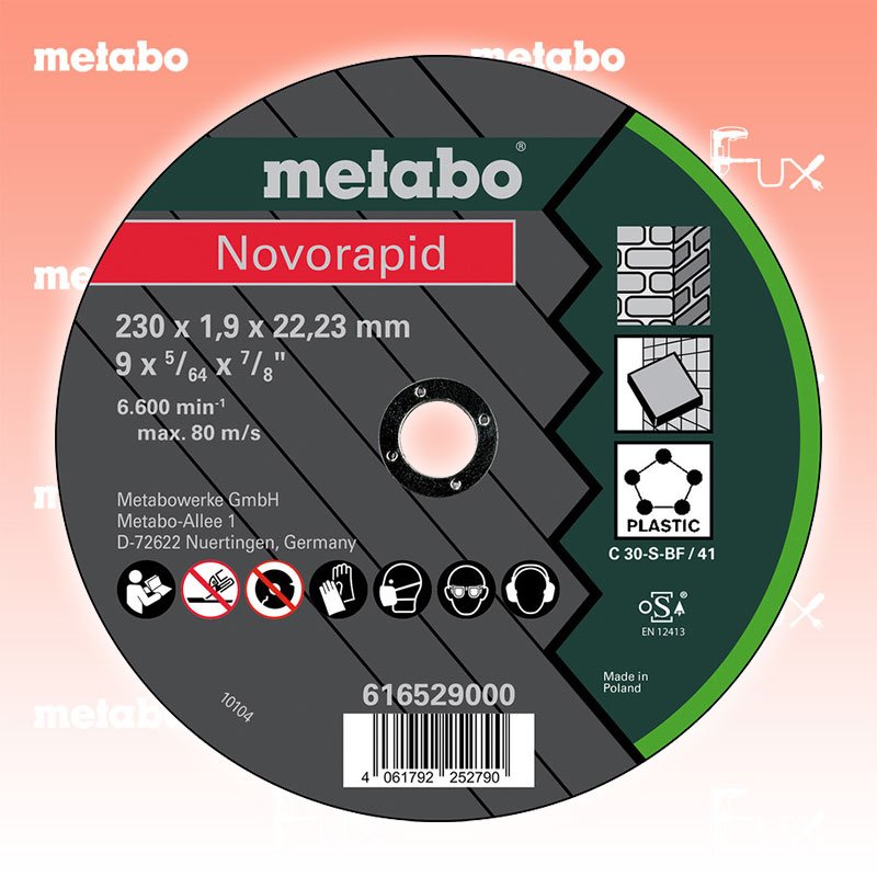 Zu "Qualitätsklasse C 30 S Trennscheiben" von Metabo Metabo Trennscheibe Stein 230 mm Bestell- und Artikelnummer: 616529000 Dünne Trennscheibe für den universellen Gebrauch, wie z.B. zur Bearbeitung von Stein, Fliesen, Kuststoffe, etc. Gute Schnittleistung bei guter Standzeit Geringer Materialverbrauch, kraftsparend, geringe Maschinenbelastung Härte: hart Arbeitshöchstgeschwindigkeit 80 m/s Technische Daten Qualitätsklasse C 30-S Durchmesser x Dicke x Bohrung 230 x 1.9 x 22.23 mm Ausführung gerade Max. Drehzahl 6600 /min Standard-Ausrüstung Verkaufseinheit 25 Stk. Listenpreis CHF 137.50 Fuxpreis CHF 117.00 inklusive 8.1% MwSt Frankolieferung Kein Grauimport! Produkt bestellen Verkaufseinheit 25 Stk. 1 Stück 2 Stück 3 Stück 4 Stück 5 Stück 6 Stück 7 Stück 8 Stück 9 Stück 10 Stück 11 Stück 12 Stück 13 Stück 14 Stück 15 Stück 16 Stück 17 Stück 18 Stück 19 Stück 20 Stück 21 Stück 22 Stück 23 Stück 24 Stück 25 Stück 26 Stück 27 Stück 28 Stück 29 Stück 30 Stück 31 Stück 32 Stück 33 Stück 34 Stück 35 Stück 36 Stück 37 Stück 38 Stück 39 Stück 40 Stück 41 Stück 42 Stück 43 Stück 44 Stück 45 Stück 46 Stück 47 Stück 48 Stück 49 Stück 50 Stück Alle Angaben ohne Gewähr und solange Vorrat reicht!Wiederverkäufer werden?Lehrlingsrabatt? Produkt als PDF AKTION 15%