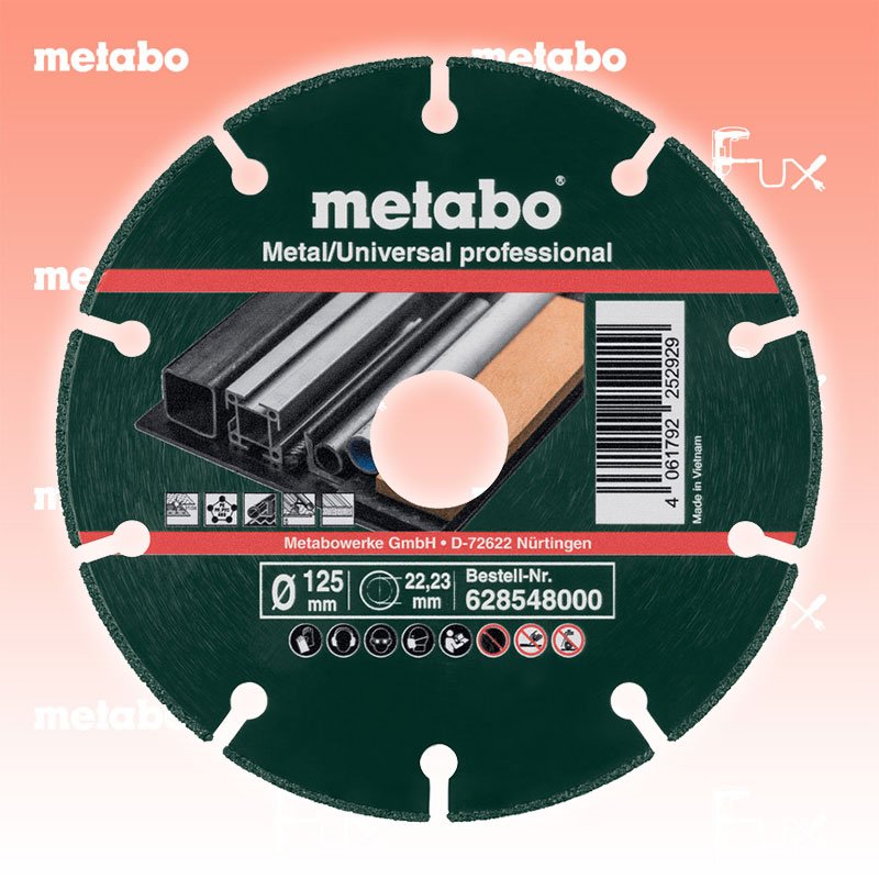 Zu "Winkelschleifer Diamanttrennscheibe" von Metabo Metabo Diamanttrennscheibe 125 mm Bestell- und Artikelnummer: 628548000 Vakuum-gelötete Diamanttrennscheibe für nahezu alle Metallwerkstoffe; sehr flexibel einsetzbar auch in verschiedenen Materialien auf Grund des Vakuumlöt Verfahrens, wie z.B. Rohre, Profile, Kunststoffe,.. Reduzierter Funkenflug, reduzierte Geruchs- und Staubbildung Extrem hohe Lebensdauer in Metall Konstante Schnitttiefe über die gesamte Lebensdauer Technische Daten Durchmesser x Bohrung 125 x 22.23 mm Segmentabmessungen 1.3 x 1.5 mm Segmentanzahl 10 Max. Drehzahl 12000 /min Standard-Ausrüstung Verkaufseinheit 10 Stk. Geliefert im Blister Fuxpreis CHF 350.00 inklusive 8.1% MwSt Frankolieferung Kein Grauimport! Produkt bestellen Verkaufseinheit 10 Stk. 1 Stück 2 Stück 3 Stück 4 Stück 5 Stück 6 Stück 7 Stück 8 Stück 9 Stück 10 Stück 11 Stück 12 Stück 13 Stück 14 Stück 15 Stück 16 Stück 17 Stück 18 Stück 19 Stück 20 Stück 21 Stück 22 Stück 23 Stück 24 Stück 25 Stück 26 Stück 27 Stück 28 Stück 29 Stück 30 Stück 31 Stück 32 Stück 33 Stück 34 Stück 35 Stück 36 Stück 37 Stück 38 Stück 39 Stück 40 Stück 41 Stück 42 Stück 43 Stück 44 Stück 45 Stück 46 Stück 47 Stück 48 Stück 49 Stück 50 Stück Alle Angaben ohne Gewähr und solange Vorrat reicht!Wiederverkäufer werden?Lehrlingsrabatt? Produkt als PDF AKTION