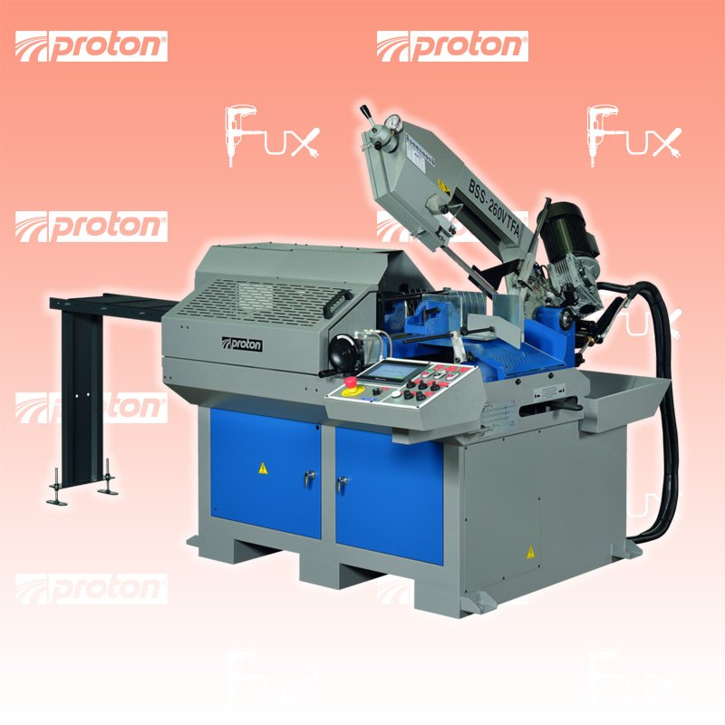 Zu "Metallbandsägen" von Proton Proton BSS-260VTFA Metallbandsäge Bestell- und Artikelnummer: 120700 Die vollautomatische, stationäre Metallbandsäge mit stufenloser Geschwindigkeitseinstellung. Die Absenkung und Anhebung sowie der Materialnachschub ist vollautomatisch. Der Schraubstock ermöglicht angenehmes Arbeiten, indem man das Werkstück sicher und einfach einspannen kann. Die Schraubstockführung ist Kugelgelagert, was die Feineinstellung und ein präzises Arbeiten ermöglicht. Die Metallbandsäge verfügt über eine Bandbruchabschaltung, welche Sicherheit bietet. Der Sägearm ist bis 60° schwenkbar (Vollautomatisch ≤ 45° / Halbautomatisch 60°). Die Zufuhrrollbahn ist 1000 mm lang und 310 mm breit. Kugelgelagerte Bandführung Kühlmittelsystem Motorkühlwasserpumpe 0.15 kW Hydraulische Absenkung und Anhebung Hydraulischer Spannstock mit Schnellverstellung Sägearm links und rechts schwenkbar Spanndruckmanometer Bandbruchabschaltung Spritzschutzbleche Technische Daten Spannung: 400 V Leistung: 1.25 kW Motor Kühlwasserpumpe: 0.15 kW Kühlsystem integriert: ja Sockel inkl.: ja Einstellung stufenlos Geschwindigkeit: ja Sägeband inkl.: ja Absenkung hydraulisch: ja Bandbruchabschaltung: ja Schnittbereich rund 90°: 260 mm Schnittbereich rund 45° rechts: 240 mm Tischhöhe: 910 mm Spanndruckmanometer: ja Spritzschutzbleche: ja Schnittbereich quadratisch 90°: 255 mm Schnittkapazität quadratisch 45° rechts: 215 mm Schnittbereich quadratisch 60° rechts: 130 mm Fahrbar: nein Sägearm schwenkbar: 45 ° Sägebandmass: 2965 x 27 x 0.9 mm Schnittbereich rund 60°: 160 mm Band / Blattgeschwindigkeit: variabel Schnittbereich rund 45° links: 240 mm Schnittbereich rund 90° Vollmaterial: 100 mm Schnittbereich rund 45° rechts Vollmaterial: 80 mm Schnittbereich rund 45° links Vollmaterial: 80 mm Schnittbereich quadratisch 45° links: 215 mm Spannstocköffnung: 300 mm Schnittbereich quadratisch 60° links: 130 mm Schnittbereich rund 60° Vollmaterial: 50 mm Abmessung (L x B x H): 2800 x 1800 x 1800 mm Gewicht: 680 kg Zubehör Listenpreis CHF 19'900.00 Fuxpreis CHF 16'915.00 inklusive 8.1% MwSt Frankolieferung Kein Grauimport! Produkt bestellen 1 Stück 2 Stück 3 Stück 4 Stück 5 Stück 6 Stück 7 Stück 8 Stück 9 Stück 10 Stück Alle Angaben ohne Gewähr und solange Vorrat reicht!Lehrlingsrabatt? Produkt als PDF AKTION 15%