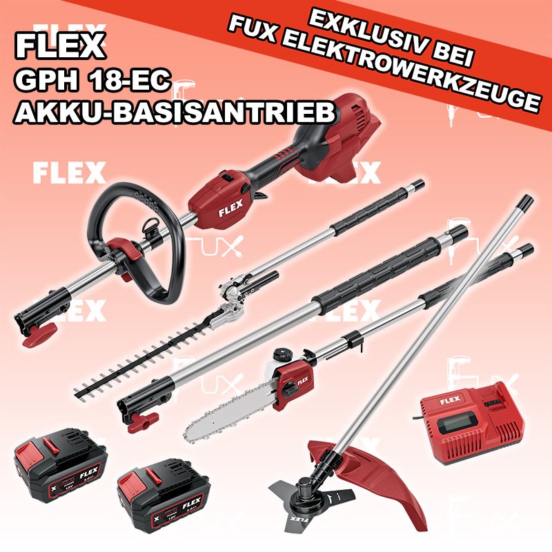 Flex GPH 18-EC Akku-Basisantrieb GPH 18-EC Akku-Basisantrieb GBC-A Freischneider-Vorsatz GEX-A Verlängerung GHT-A Heckenscheren-Vorsatz GPS-A Hochentaster-Vorsatz AP 18.0/5.0+ Akku-Pack Li-Ion CA 12/18 230/CEE Ladegerät