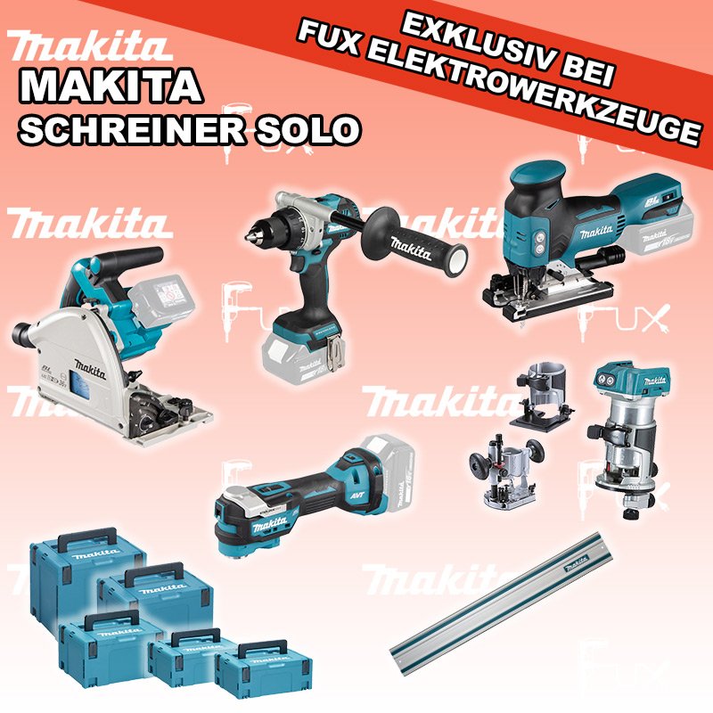 Zu "Schreiner Set" von Makita FUX SPECIAL EXKLUSIV BEI FUX Makita Schreiner Set 1 SOLO Bestell- und Artikelnummer: maSchreiner Set 1 SOLO DSP600ZJ Eintauch-KreissägeAkkuspannung 2 x 18 V Sägeblatt (Ø) 165 mm Schnitttiefe bei 90° 56 mm Gewicht 5.1 kg Infos DTM52Z Multifunktions WerkzeugAkkuspannung 18 V Schwingungen 10000 - 20000 min-1 Werkzeugaufnahme Starlock Max System Gewicht inkl. Akku 2.0 kg Infos DJV18ZJ Akku-StichsägeAkkuspannung 18 V Hubzahl 800 - 3500/ min Schnittleistung Holz 135 mm / Stahl 10 mm Gewicht 2.5 kgInfos DRT50ZJX11 Akku-Einhandfräse / Kantenfräse Akkuspannung 18 V Leerlaufdrehzahl 10000 - 30000 min-1 Tiefeneinstellung bis 40 mm Gewicht 2.0 kgInfos DDF492Z Akku-BohrschrauberAkkuspannung 18 V Leerlaufdrehzahl 0 - 550 / 0 - 2100 min⁻¹ Drehmoment hart / weich 130 / 65 Nm Gewicht inkl. Akku 2.3 - 2.6 kgInfos Führungsschiene L = 140 cmgeeignet für SP6000 Handkreissäge mit passenden Adapter Auch für weitere Handkreissägen und Stichsägen geeignet mit passendem Adapter. ( 194579-2 )Infos MAKPAC Gr. 2Produktabmessung (L x B x H) 395 x 295 x 163 mm Infos MAKPAC Gr. 3Produktabmessung (L x B x H) 377 x 277 x 176 mm Infos Einsatz für diverse Akkuschrauber Einsatz für DDF343ZJ, DDF441, DDF446, DDF448, DDF451, DDF453, DDF456R, DDF458, DDF459, DDF480, DDF481, DDF482, DDF484, DDF485, DDF486, DHP441, DHP446, DHP448, DHP451, DHP456, DHP458, DHP459, DHP470, DHP480, DHP481, DHP482, DHP484, DHP485, DHP486, DLX2126TJ1, DLX3092TJInfos Einsatz für DTM52 Einsatz für DTM52 Makpac Koffer Typ C (821551-8) Infos OHNE AKKUS UND LADEGERÄT Standard-Ausrüstung In diesem Set enthalten: DSP600ZJ Eintauch-Kreissäge DTM52Z Multifunktions Werkzeug DJV18ZJ Akku-Stichsäge DRT50ZJX11 Akku-Einhandfräse / Kantenfräse DDF492Z Akku-Bohrschrauber Führungsschiene L = 140 cm MAKPAC Gr. 2 MAKPAC Gr. 3 Einsatz für diverse Akkuschrauber Einsatz für DTM52 Geliefert im Koffer Zubehör Verbrauchsmaterial Listenpreis CHF 2'123.00 Fuxpreis CHF 1'431.00 inklusive 8.1% MwSt Versand CHF 20.00 Kein Grauimport! Produkt bestellen 1 Stück 2 Stück 3 Stück 4 Stück 5 Stück 6 Stück 7 Stück 8 Stück 9 Stück 10 Stück Option: Makita BL 1860 B ( Li-lon Akku ) für CHF 95.- statt CHF 124.-Infos Alle Angaben ohne Gewähr und solange Vorrat reicht!Wiederverkäufer werden? Produkt als PDF AKTION 32%