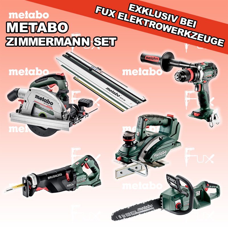 Metabo Zimmermann SET  4 SOLO BS 18 LTX BL Q I Akku-Bohrschrauber MS 36-18 LTX BL 40 Akku-Kettensäge SSEP 18 LTX BL MVT Akku-Säbelsäge HO 18 LTX 20-82 Akku-Einhand-Hobel KS 18 LTX 66 BL Akku Handkreissäge Kappschiene KFS 44