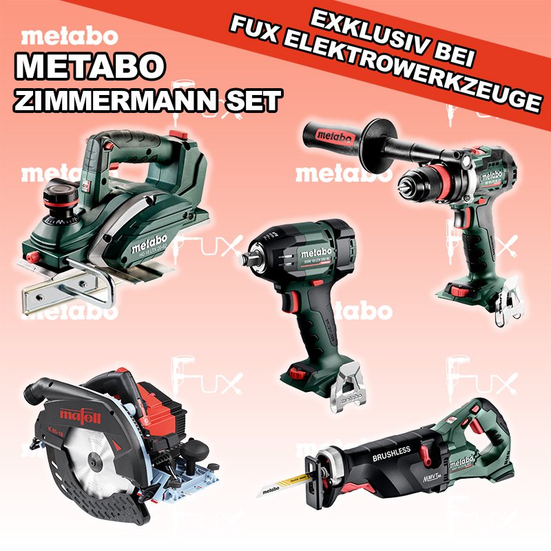 Zu "Zimmermann Set" von Metabo FUX SPECIAL EXKLUSIV BEI FUX Metabo Zimmermann SET 7 SOLO Bestell- und Artikelnummer: Zimmermann SET 7 SOLO FULL Service: 36 Monate zum Nulltarif für Sie! Weitere Infos zum FULL Service Dieses Produkt ist CAS kompatibel! Weitere Infos zu CAS BS 18 LTX BL Q I Akku-BohrschrauberAkkuspannung 18 V Drehzahl 0-550 / 0-2000 U/min Drehmoment hart / weich 130 / 65 Nm Gewicht (mit Akkupack) 2.3 kgInfos SSW 18 LTX 550 BL Akku-SchlagschrauberAkkuspannung 18 V Anziehdrehmoment 550 Nm Werkzeugaufnahme 1/2" Gewicht ohne Akkupack 1,4 kgInfos SSEP 18 LTX BL MVT Akku-SäbelsägeAkkuspannung 18 V Hubzahl bei Leerlauf 0 - 3.000 /min Gewicht (mit Akkupack) 4.6 kgInfos HO 18 LTX 20-82 Akku-Einhand-HobelAkkuspannung 18 V Hobelbreite 82 mm Spanabnahme einstellbar 0-2 mm Gewicht 3.5 KgInfos K 85 - 18 PURE Akku-Handkreissägen im L-MAXSchnitttiefe 0 – 88 mm Schnitttiefe bei 45° 0 – 61.5 mm Gewicht (mit Akku) 8.1 kgInfos Registriere die in diesem Set vorhandenen Metabo Maschinen auf metabo.ch, und ergattere dir bis zu 5 Gratis Akkus!Zusätzlich offerieren wir zu diesem Set einen Gratis Akku!OHNE AKKUS UND LADEGERÄT Standard-Ausrüstung In diesem Set enthalten: BS 18 LTX BL Q I Akku-Bohrschrauber SSW 18 LTX 550 BL Akku-Schlagschrauber SSEP 18 LTX BL MVT Akku-Säbelsäge HO 18 LTX 20-82 Akku-Einhand-Hobel K 85 - 18 PURE Akku-Handkreissägen im L-MAX Listenpreis CHF 2'579.70 Fuxpreis CHF 2'038.00 inklusive 8.1% MwSt Versand CHF 25.00 Kein Grauimport! Produkt bestellen 1 Stück 2 Stück 3 Stück 4 Stück 5 Stück 6 Stück 7 Stück 8 Stück 9 Stück 10 Stück Alle Angaben ohne Gewähr und solange Vorrat reicht!Wiederverkäufer werden? Produkt als PDF AKTION 21%