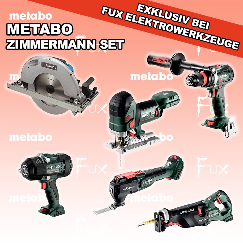 Zu "Zimmermann Set" von Metabo FUX SPECIAL EXKLUSIV BEI FUX Metabo Zimmermann SET 19 SOLO Bestell- und Artikelnummer: Zimmermann SET 19 SOLO FULL Service: 36 Monate zum Nulltarif für Sie! Weitere Infos zum FULL Service Dieses Produkt ist CAS kompatibel! Weitere Infos zu CAS BS 18 LTX BL Q I Akku-BohrschrauberAkkuspannung 18 V Drehzahl 0-550 / 0-2000 U/min Drehmoment hart / weich 130 / 65 Nm Gewicht (mit Akkupack) 2.3 kgInfos SSW 18 LTX 1450 BL Akku-SchlagschrauberAkkuspannung 18 V Anziehdrehmoment 1450 Nm Werkzeugaufnahme 1/2" Infos SSEP 18 LTX BL MVT Akku-SäbelsägeAkkuspannung 18 V Hubzahl bei Leerlauf 0 - 3.000 /min Gewicht (mit Akkupack) 4.6 kgInfos 5143 R HandkreissägeLeistungsaufnahme 2200 Watt 50 - 130 mm Schnitt-Tiefe bei 90° Leerlaufdrehzahl 2700 U/min Gewicht 14.5 kgInfos MT 18 LTX BL QSL Akku-Multitool Akkuspannung 18 V Schwingzahl bei Leerlauf 8.000 - 20.000 /min Schleifplatte, Maß Eck zu Eck 93 mm Gewicht 1.7 kgInfos STA 18 LTX 150 BL Akku-StichsägeAkkuspannung 18 V Hubzahl 1.000-3.500 /min Gewicht ohne Akkupack 1.9 kgInfos Registriere die in diesem Set vorhandenen Metabo Maschinen auf metabo.ch, und ergattere dir bis zu 5 Gratis Akkus!Zusätzlich offerieren wir zu diesem Set einen Gratis Akku!OHNE AKKUS UND LADEGERÄT Standard-Ausrüstung In diesem Set enthalten: BS 18 LTX BL Q I Akku-Bohrschrauber SSW 18 LTX 1450 BL Akku-Schlagschrauber SSEP 18 LTX BL MVT Akku-Säbelsäge 5143 R Handkreissäge MT 18 LTX BL QSL Akku-Multitool STA 18 LTX 150 BL Akku-Stichsäge Listenpreis CHF 3'054.00 Fuxpreis CHF 2'112.00 inklusive 8.1% MwSt Versand CHF 25.00 Kein Grauimport! Produkt bestellen 1 Stück 2 Stück 3 Stück 4 Stück 5 Stück 6 Stück 7 Stück 8 Stück 9 Stück 10 Stück Alle Angaben ohne Gewähr und solange Vorrat reicht!Wiederverkäufer werden? Produkt als PDF AKTION 30%
