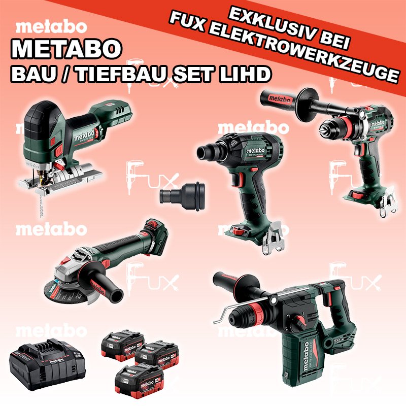 Metabo Bau / Tiefbau Set  1 BS 18 LTX BL Q I Akku-Bohrschrauber STA 18 LTX 150 BL Akku-Stichsäge KH 18 LTX BL 24 Q Akku-Kombihammer WVB 18 LT BL 11-125 Quick Akku-Winkelschleifer SSW 18 LTX 300 BL Akku-Schlagschrauber Reduktions Adapter Basis-Set  5.5 Ah LiHD 3x Akkupack