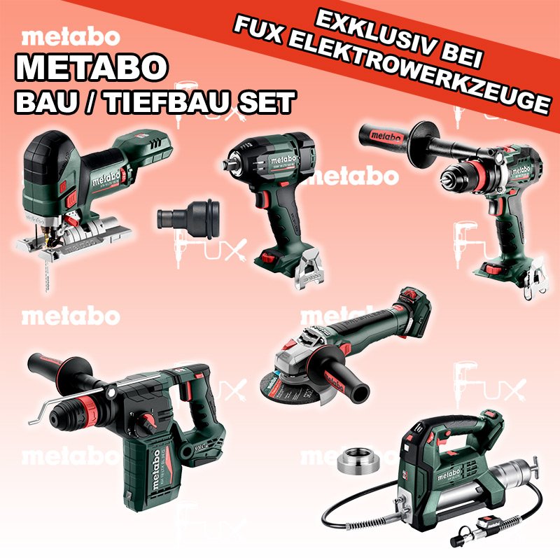 Zu "Bau / Tiefbau Set" von Metabo FUX SPECIAL EXKLUSIV BEI FUX Metabo Bau / Tiefbau Set 2 SOLO Bestell- und Artikelnummer: Bau / Tiefbau Set 2 SOLO FULL Service: 36 Monate zum Nulltarif für Sie! Weitere Infos zum FULL Service BS 18 LTX BL Q I Akku-BohrschrauberAkkuspannung 18 V Drehzahl 0-550 / 0-2000 U/min Drehmoment hart / weich 130 / 65 Nm Gewicht (mit Akkupack) 2.3 kgInfos STA 18 LTX 150 BL Akku-StichsägeAkkuspannung 18 V Hubzahl 1.000-3.500 /min Gewicht ohne Akkupack 1.9 kgInfos KH 18 LTX BL 24 Q Akku-KombihammerAkkuspannung 18 V Einzelschlagstärke 2.2 J Bohrleistung in Beton 24 mm Gewicht ohne Akkupack 3 kgInfos WVB 18 LT BL 11-125 Quick Akku-WinkelschleiferAkkuspannung 18 V Drehzahl 2.800 - 10.000 / min Ø 125 mm Scheiben Gewicht (mit Akkupack) 2.5 kgInfos SSW 18 LTX 550 BL Akku-SchlagschrauberAkkuspannung 18 V Anziehdrehmoment 550 Nm Werkzeugaufnahme 1/2" Gewicht ohne Akkupack 1,4 kgInfos Adapter mit 1/2“ auf 1/4"Adapter mit 1/2“ Innenvierkant maschinenseitig und 1/4“ Innensechskant für schlagfeste Einsatzwerkzeuge mit 1/4“ SchaftInfos FP 18 LTX Akku FettpresseAkkuspannung 18 V Maximaler Druck 690 bar Auspressgeschwindigkeit 100 / 290 ml/min Gewicht inkl. Akku 4.4 kgInfos Adapter für Lube-Shuttle® 400GAdapter zum Umrüsten von Fettbehälter auf Lube-Shuttle®* Kartusche 400g geeignet für FP 18 LTXInfos Registriere die in diesem Set vorhandenen Metabo Maschinen auf metabo.ch, und ergattere dir bis zu 5 Gratis Akkus!Zusätzlich offerieren wir zu diesem Set einen Gratis Akku!OHNE AKKUS UND LADEGERÄT Standard-Ausrüstung In diesem Set enthalten: BS 18 LTX BL Q I Akku-Bohrschrauber STA 18 LTX 150 BL Akku-Stichsäge KH 18 LTX BL 24 Q Akku-Kombihammer WVB 18 LT BL 11-125 Quick Akku-Winkelschleifer SSW 18 LTX 550 BL Akku-Schlagschrauber Adapter mit 1/2“ auf 1/4" FP 18 LTX Akku Fettpresse Adapter für Lube-Shuttle® 400G Listenpreis CHF 2'182.50 Fuxpreis CHF 1'491.00 inklusive 8.1% MwSt Frankolieferung Kein Grauimport! Produkt bestellen 1 Stück 2 Stück 3 Stück 4 Stück 5 Stück 6 Stück 7 Stück 8 Stück 9 Stück 10 Stück Alle Angaben ohne Gewähr und solange Vorrat reicht!Wiederverkäufer werden? Produkt als PDF AKTION 31%
