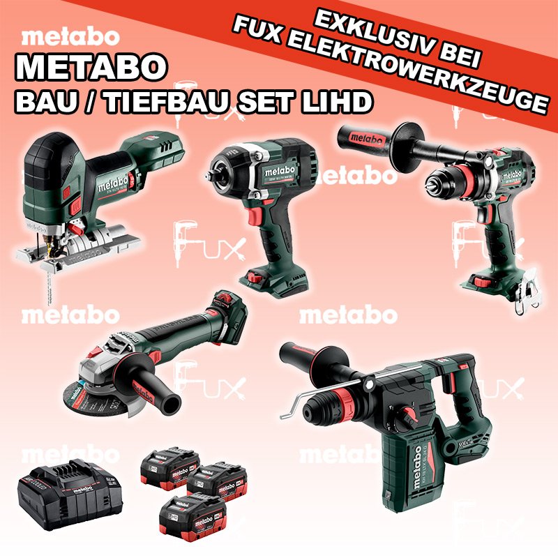 Zu "Bau / Tiefbau Set" von Metabo FUX SPECIAL EXKLUSIV BEI FUX Metabo Bau / Tiefbau Set 4 Bestell- und Artikelnummer: Bau / Tiefbau Set 4 FULL Service: 36 Monate zum Nulltarif für Sie! Weitere Infos zum FULL Service BS 18 LTX BL Q I Akku-BohrschrauberAkkuspannung 18 V Drehzahl 0-550 / 0-2000 U/min Drehmoment hart / weich 130 / 65 Nm Gewicht (mit Akkupack) 2.3 kgInfos STA 18 LTX 150 BL Akku-StichsägeAkkuspannung 18 V Hubzahl 1.000-3.500 /min Gewicht ohne Akkupack 1.9 kgInfos KH 18 LTX BL 28 Q Akku-KombihammerAkkuspannung 18 V Einzelschlagstärke 3 J Bohrleistung in Beton 28 mm Gewicht ohne Akkupack 3,4 kgInfos WB 18 LTX BL 15-125 Quick Akku-Winkelschleifer Akkuspannung 18 V so stark wie ein 1500 Watt Netzgerät Drehzahl 10000 U / min Ø 125 mm Scheiben Gewicht mit Akkupack 2,7 kgInfos SSW 18 LTX 800 BL Akku-Schlagschrauber Akkuspannung 18 V Anziehdrehmoment 800 Nm Werkzeugaufnahme 1/2" Gewicht 2.6 kgInfos 3 x 18 V, 5.5 Ah, LiHD Akkupack18 V 5.5 Ah ( LiHD Akkus ) Infos ASC 145, 12 - 36 V "Air Cooled" LadegerätZum Aufladen aller Li-Power Schiebesitz-Akkupacks (12 V - 36 V). Ladestrom 8.0 AInfos Registriere die in diesem Set vorhandenen Metabo Maschinen auf metabo.ch, und ergattere dir bis zu 5 Gratis Akkus!Zusätzlich offerieren wir zu diesem Set einen Gratis Akku! Standard-Ausrüstung In diesem Set enthalten: BS 18 LTX BL Q I Akku-Bohrschrauber STA 18 LTX 150 BL Akku-Stichsäge KH 18 LTX BL 28 Q Akku-Kombihammer WB 18 LTX BL 15-125 Quick Akku-Winkelschleifer SSW 18 LTX 800 BL Akku-Schlagschrauber 3 x 18 V, 5.5 Ah, LiHD Akkupack ASC 145, 12 - 36 V "Air Cooled" Ladegerät Listenpreis CHF 2'387.00 Fuxpreis CHF 1'624.00 inklusive 8.1% MwSt Frankolieferung Kein Grauimport! Produkt bestellen 1 Stück 2 Stück 3 Stück 4 Stück 5 Stück 6 Stück 7 Stück 8 Stück 9 Stück 10 Stück Alle Angaben ohne Gewähr und solange Vorrat reicht!Wiederverkäufer werden? Produkt als PDF AKTION 31%