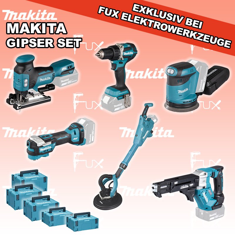 Makita Gipser Set  1 SOLO DDF484ZJ Akku-Bohrschrauber DFR552Z Akku-Magazinschrauber DSL801ZU Akku-Langhalsschleifer DBO180ZJ Akku-Exzenterschleifer DTM52Z Multifunktions Werkzeug DJV18ZJ Akku-Stichsäge MAKPAC Gr. 3 Einsatz für DFR551 Einsatz für DTM52