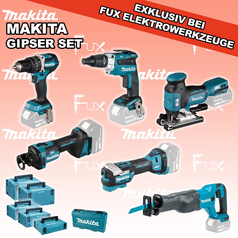 Makita Gipser Set  9 SOLO DHP484ZJ Akku-Schlagbohrschrauber DFS251ZJ Akku-Schrauber DTM52Z Multifunktions Werkzeug DCO181Z Akku-Rotationsschneider DJR186ZK Akku-Säbelsäge DJV18ZJ Akku-Stichsäge MAKPAC Gr. 3 Einsatz für DTM52 MAKPAC Gr. 1 Einsatz für DCO181
