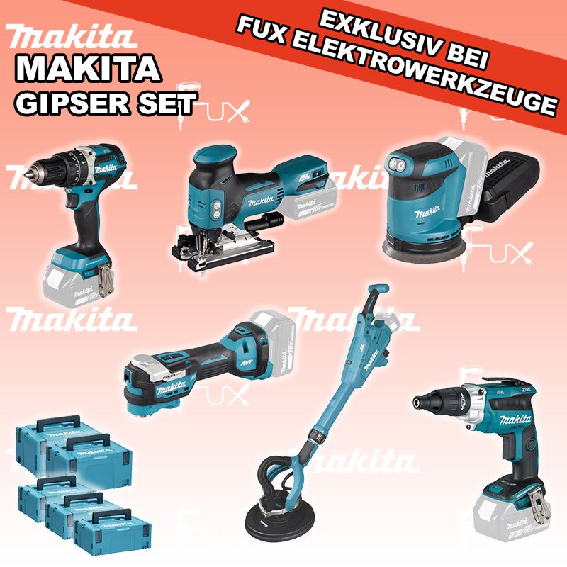 Makita Gipser Set 12 SOLO DHP484ZJ Akku-Schlagbohrschrauber DFS251ZJ Akku-Schrauber DSL801ZU Akku-Langhalsschleifer DBO180ZJ Akku-Exzenterschleifer DTM52Z Multifunktions Werkzeug DJV18ZJ Akku-Stichsäge MAKPAC Gr. 3 Einsatz für DTM52
