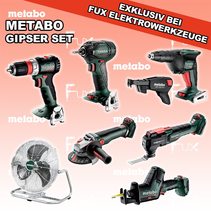 Zu "Gipser Set" von Metabo FUX SPECIAL EXKLUSIV BEI FUX Metabo Gipser Set 5 SOLO Bestell- und Artikelnummer: Gipser Set 5 SOLO FULL Service: 36 Monate zum Nulltarif für Sie! Weitere Infos zum FULL Service BS 18 L BL Q Akku-BohrschrauberAkkuspannung 18 V Drehzahl 0 - 500 / 0 - 1700 /min Drehmoment hart / weich 60 / 28 Nm Gewicht (mit Akkupack) 1.3 kgInfos TBS 18 LTX BL 5000 Akku-TrockenbauschrauberAkkuspannung 18 V Leerlaufdrehzahl 0 - 5.000 /min Max. Drehmoment weich 6 Nm Gewicht mit Akkupack 1,3 kgInfos SSD 18 LTX 200 BL Akku-Schlagschrauber Akkuspannung 18 V Anziehdrehmoment 200 Nm Werkzeugaufnahme 1/4" Gewicht 1.3 kgInfos WVB 18 LT BL 11-125 Quick Akku-WinkelschleiferAkkuspannung 18 V Drehzahl 2.800 - 10.000 / min Ø 125 mm Scheiben Gewicht (mit Akkupack) 2.5 kgInfos SSE 18 LTX BL Compact Akku-SäbelsägeAkkuspannung 18 V Hubzahl 0-3000 min-1 Hublängen 16 mm Gewicht (mit Akkupack) 1.8 kgInfos MT 18 LTX BL QSL Akku-Multitool Akkuspannung 18 V Schwingzahl bei Leerlauf 8.000 - 20.000 /min Schleifplatte, Maß Eck zu Eck 93 mm Gewicht 1.7 kgInfos AV 18 Akku-VentilatorAkkuspannung 18 V Max. Luftgeschwindigkeit 3,8 m/s Flügeldurchmesser 355 mm Gewicht (mit Akkupack) 1,2 kgInfos Schrauber-Magazin Speed Fix 57Robustes Schrauber-Magazin geeignet für TBS 18 LTX 5000 und HBS 18 LTX 3000Infos Ergattere dir einen Akku bei der Registration auf metabo.ch Alle Produkte dieser Aktion anzeigen OHNE AKKUS UND LADEGERÄT Standard-Ausrüstung In diesem Set enthalten: BS 18 L BL Q Akku-Bohrschrauber TBS 18 LTX BL 5000 Akku-Trockenbauschrauber SSD 18 LTX 200 BL Akku-Schlagschrauber WVB 18 LT BL 11-125 Quick Akku-Winkelschleifer SSE 18 LTX BL Compact Akku-Säbelsäge MT 18 LTX BL QSL Akku-Multitool AV 18 Akku-Ventilator Schrauber-Magazin Speed Fix 57 Listenpreis CHF 1'924.50 Fuxpreis CHF 1'310.00 inklusive 8.1% MwSt Frankolieferung Kein Grauimport! Produkt bestellen 1 Stück 2 Stück 3 Stück 4 Stück 5 Stück 6 Stück 7 Stück 8 Stück 9 Stück 10 Stück Alle Angaben ohne Gewähr und solange Vorrat reicht!Wiederverkäufer werden? Produkt als PDF NEUHEITAKTION 31%