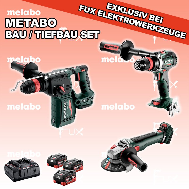 Zu "Bau / Tiefbau Set" von Metabo FUX SPECIAL EXKLUSIV BEI FUX Metabo Bau / Tiefbau Set 5 Bestell- und Artikelnummer: Bau / Tiefbau Set 5 FULL Service: 36 Monate zum Nulltarif für Sie! Weitere Infos zum FULL Service BS 18 LTX BL Q I Akku-BohrschrauberAkkuspannung 18 V Drehzahl 0-550 / 0-2000 U/min Drehmoment hart / weich 130 / 65 Nm Gewicht (mit Akkupack) 2.3 kgInfos KH 18 LTX BL 24 Q Akku-KombihammerAkkuspannung 18 V Einzelschlagstärke 2.2 J Bohrleistung in Beton 24 mm Gewicht ohne Akkupack 3 kgInfos WVB 18 LT BL 11-125 Quick Akku-WinkelschleiferAkkuspannung 18 V Drehzahl 2.800 - 10.000 / min Ø 125 mm Scheiben Gewicht (mit Akkupack) 2.5 kgInfos 3 x 18 V, 5.5 Ah, LiHD Akkupack18 V 5.5 Ah ( LiHD Akkus ) Infos ASC 145, 12 - 36 V "Air Cooled" LadegerätZum Aufladen aller Li-Power Schiebesitz-Akkupacks (12 V - 36 V). Ladestrom 8.0 AInfos Registriere die in diesem Set vorhandenen Metabo Maschinen auf metabo.ch, und ergattere dir bis zu 5 Gratis Akkus!Zusätzlich offerieren wir zu diesem Set einen Gratis Akku! Standard-Ausrüstung In diesem Set enthalten: BS 18 LTX BL Q I Akku-Bohrschrauber KH 18 LTX BL 24 Q Akku-Kombihammer WVB 18 LT BL 11-125 Quick Akku-Winkelschleifer 3 x 18 V, 5.5 Ah, LiHD Akkupack ASC 145, 12 - 36 V "Air Cooled" Ladegerät Listenpreis CHF 1'509.00 Fuxpreis CHF 1'031.00 inklusive 8.1% MwSt Frankolieferung Kein Grauimport! Produkt bestellen 1 Stück 2 Stück 3 Stück 4 Stück 5 Stück 6 Stück 7 Stück 8 Stück 9 Stück 10 Stück Alle Angaben ohne Gewähr und solange Vorrat reicht!Wiederverkäufer werden? Produkt als PDF NEUHEITAKTION 31%