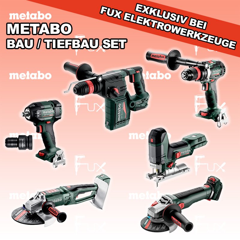 Metabo Bau / Tiefbau Set 10 SOLO BS 18 LTX BL Q I Akku-Bohrschrauber ST 18 LT 130 BL  Akku-Stichsäge KH 18 LTX BL 24 Q Akku-Kombihammer WVB 18 LT BL 11-125 Quick Akku-Winkelschleifer WPB 36-18 LTX BL 24-230 Akku-Winkelschleifer SSW 18 LTX 550 BL Akku-Schlagschrauber Adapter für Lube-Shuttle® 400G