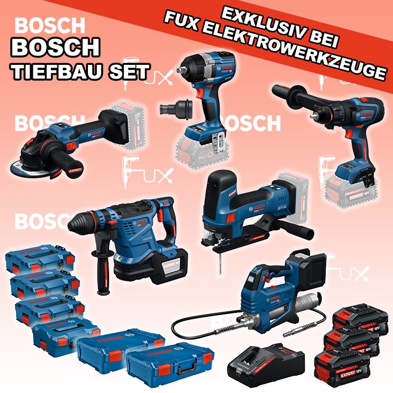 Zu "Bau / Tiefbau Set" von Bosch Professional FUX SPECIAL EXKLUSIV BEI FUX Bosch Expert EXTiefbau Set 2 Bestell- und Artikelnummer: EXTiefbau Set 2 5 Jahre Garantie auf Bosch Expert Maschinen / Zubehör EXSR18V-150 Akku-BohrschrauberAkkuspannung 18 V Drehmoment 84 / 100 / 150 Nm Leerlaufdrehzahl 0 – 550 / 0 – 2200 min⁻¹ Gewicht exkl. Akku 2.1 kgInfos EXBH18V-32F Akku-BohrhammerAkkuspannung 18 V Nenn-Schlagenergie 4.5 J Schlagzahl bei Nenndrehzahl 4300 bpm Nenndrehzahl 0 – 790 min⁻¹ Gewicht exkl. Akku 4.2 kgInfos EXST18V-155S Akku-StichsägeAkkuspannung 18 V Hubzahl bei Leerlauf 800 - 3800 min⁻¹ Hubhöhe 26 mm Gewicht exkl. Akku 1.9 kgInfos EXWS18V-15S Akku-WinkelschleiferAkkuspannung 18 V Leerlaufdrehzahl 11000 min⁻¹ Scheiben-Ø 125 mm Gewicht exkl. Akku 2.2 kgInfos GDS 18V-750 C Akku-DrehschlagschrauberAkkuspannung 18 V Drehzahlen 0 - 2400 min⁻¹ Drehmoment, max. 750 Nm Gewicht exkl. Akku 1.7 kgInfos GFP 18V-10 Akku-KartuschenpresseAkkuspannung 18 V Druck max. 9’999.9 psi Durchflussmenge bis 320 g/minInfos Reduktions Adapter 1/2" auf 1/4" Aufnahme Max. 350 Nm Länge 45 mmInfos 3x EXBA18V-80 + EXAL18V-160 Starter-Set3 x EXBA18V-80 Akkupack EXAL18V-160 LadegerätInfos Standard-Ausrüstung In diesem Set enthalten: EXSR18V-150 Akku-Bohrschrauber EXBH18V-32F Akku-Bohrhammer EXST18V-155S Akku-Stichsäge EXWS18V-15S Akku-Winkelschleifer GDS 18V-750 C Akku-Drehschlagschrauber GFP 18V-10 Akku-Kartuschenpresse Reduktions Adapter 3x EXBA18V-80 + EXAL18V-160 Starter-Set Geliefert im Koffer Zubehör Listenpreis CHF 3'218.70 Fuxpreis CHF 2'463.00 inklusive 8.1% MwSt Kostenloser Versand Kein Grauimport! Produkt bestellen 1 Stück 2 Stück 3 Stück 4 Stück 5 Stück 6 Stück 7 Stück 8 Stück 9 Stück 10 Stück Alle Angaben ohne Gewähr und solange Vorrat reicht! Produkt als PDF NEUHEITAKTION 23%