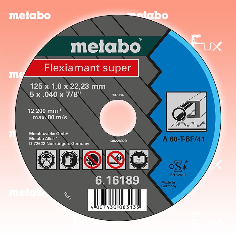 Zu "Qualitätsklasse A 60-T / A 46-T Trennscheiben" von Metabo Metabo Trennscheibe Stahl 125 mm Bestell- und Artikelnummer: 616189000 Dünne Hochleistungstrennscheibe speziell für dünnwandige Materialien wie Bleche, Rohre, Profile, Drähte Härte: hart Sehr hohe Schnittleistung bei hoher Standzeit Geringerer Materialverbrauch, kraftsparend, geringere Maschinenbelastung Arbeitshöchstgeschwindigkeit 80 m/s Technische Daten Qualitätsklasse A 60-T Durchmesser x Dicke x Bohrung 125 x 1 x 22.23 mm Ausführung gerade Max. Drehzahl 12200 Standard-Ausrüstung Verkaufseinheit 25 Stk. Listenpreis CHF 100.00 Fuxpreis CHF 85.00 inklusive 8.1% MwSt Versand CHF 15.00 Kein Grauimport! Produkt bestellen Verkaufseinheit 25 Stk. 1 Stück 2 Stück 3 Stück 4 Stück 5 Stück 6 Stück 7 Stück 8 Stück 9 Stück 10 Stück 11 Stück 12 Stück 13 Stück 14 Stück 15 Stück 16 Stück 17 Stück 18 Stück 19 Stück 20 Stück 21 Stück 22 Stück 23 Stück 24 Stück 25 Stück 26 Stück 27 Stück 28 Stück 29 Stück 30 Stück 31 Stück 32 Stück 33 Stück 34 Stück 35 Stück 36 Stück 37 Stück 38 Stück 39 Stück 40 Stück 41 Stück 42 Stück 43 Stück 44 Stück 45 Stück 46 Stück 47 Stück 48 Stück 49 Stück 50 Stück Alle Angaben ohne Gewähr und solange Vorrat reicht!Wiederverkäufer werden?Lehrlingsrabatt? Produkt als PDF AKTION 15%