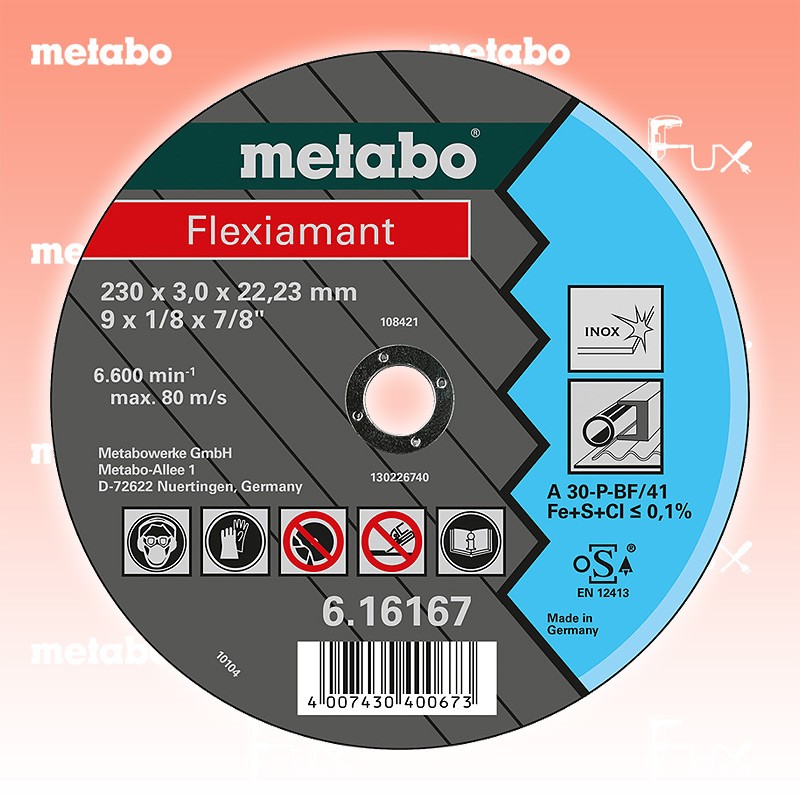 Zu "Qualitätsklasse A 30-P Trennscheiben" von Metabo Metabo Trennscheibe Stahl 115 mm Bestell- und Artikelnummer: 616737000 Universalscheibe für die Bearbeitung von rostfreien Stählen Härte: weich Hohe Schnittleistung bei hoher Standzeit Eisen- und schwefelarm < 0,1 % Arbeitshöchstgeschwindigkeit 80 m/s Technische Daten Qualitätsklasse A 30 P Durchmesser x Dicke x Bohrung 115 x 2.5 x 22.23 mm Ausführung gekröpft Max. Drehzahl 13300 Standard-Ausrüstung Verkaufseinheit 25 Stk. Listenpreis CHF 75.00 Fuxpreis CHF 64.00 inklusive 8.1% MwSt Versand CHF 15.00 Kein Grauimport! Produkt bestellen Verkaufseinheit 25 Stk. 1 Stück 2 Stück 3 Stück 4 Stück 5 Stück 6 Stück 7 Stück 8 Stück 9 Stück 10 Stück 11 Stück 12 Stück 13 Stück 14 Stück 15 Stück 16 Stück 17 Stück 18 Stück 19 Stück 20 Stück 21 Stück 22 Stück 23 Stück 24 Stück 25 Stück 26 Stück 27 Stück 28 Stück 29 Stück 30 Stück 31 Stück 32 Stück 33 Stück 34 Stück 35 Stück 36 Stück 37 Stück 38 Stück 39 Stück 40 Stück 41 Stück 42 Stück 43 Stück 44 Stück 45 Stück 46 Stück 47 Stück 48 Stück 49 Stück 50 Stück Alle Angaben ohne Gewähr und solange Vorrat reicht!Wiederverkäufer werden?Lehrlingsrabatt? Produkt als PDF AKTION 15%