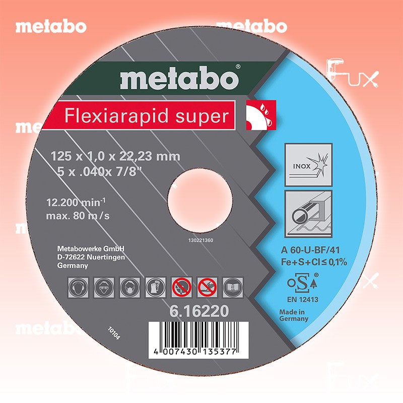 Zu "Qualitätsklasse A 36-U / A 46-U / A 60-U Trennscheiben" von Metabo Metabo Trennscheibe Stahl 150 mm Bestell- und Artikelnummer: 616224000 Die superdünne Hochleistungsscheibe speziell für die Edelstahlbearbeitung Höchste Schnittleistung bei sehr hoher Standzeit durch Verwendung von Spezialkorunden Eisen-, schwefel- und chlorfrei (Fe + S + Cl ≤ 0,1 %) Für alle rost- und säurebeständigen Stähle (V2A, Nirosta, INOX), Federstähle, Werkzeugstähle Einsetzbar im Fahrzeugbau, Behälterbau, Karosseriebau, Schaltschrankbau usw. Trennscheiben für geräuscharme, gratfreie und präzise Trennschnitte Härte: hart Arbeitshöchstgeschwindigkeit 80 m/s Technische Daten Qualitätsklasse A 46 U Durchmesser x Dicke x Bohrung 150 x 1.6 x 22.23 mm Ausführung gerade Max. Drehzahl 10200 Standard-Ausrüstung Verkaufseinheit 25 Stk. Listenpreis CHF 162.50 Fuxpreis CHF 138.00 inklusive 8.1% MwSt Frankolieferung Kein Grauimport! Produkt bestellen Verkaufseinheit 25 Stk. 1 Stück 2 Stück 3 Stück 4 Stück 5 Stück 6 Stück 7 Stück 8 Stück 9 Stück 10 Stück 11 Stück 12 Stück 13 Stück 14 Stück 15 Stück 16 Stück 17 Stück 18 Stück 19 Stück 20 Stück 21 Stück 22 Stück 23 Stück 24 Stück 25 Stück 26 Stück 27 Stück 28 Stück 29 Stück 30 Stück 31 Stück 32 Stück 33 Stück 34 Stück 35 Stück 36 Stück 37 Stück 38 Stück 39 Stück 40 Stück 41 Stück 42 Stück 43 Stück 44 Stück 45 Stück 46 Stück 47 Stück 48 Stück 49 Stück 50 Stück Alle Angaben ohne Gewähr und solange Vorrat reicht!Wiederverkäufer werden?Lehrlingsrabatt? Produkt als PDF AKTION 15%