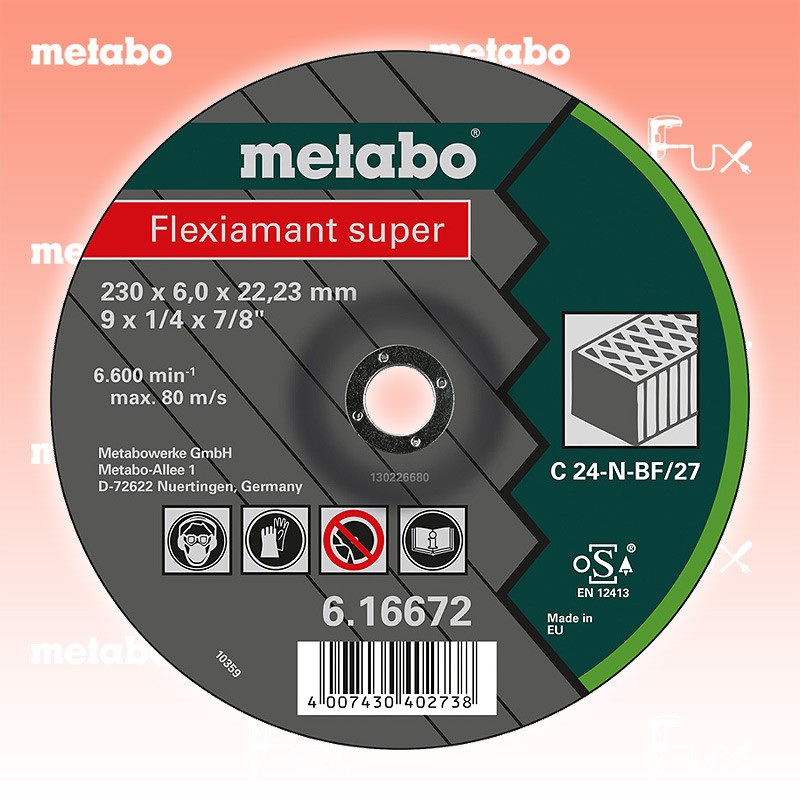 Zu "Qualitätsklasse C 24-N Schruppscheiben" von Metabo Metabo Schruppscheibe Stein 115 mm Bestell- und Artikelnummer: 616729000 Spezialscheibe für Schrupparbeiten an Beton, Natur- und Kunststein Härte: weich Hohe Abtragsleistung bei hoher Standzeit Arbeitshöchstgeschwindigkeit 80 m/s Technische Daten Qualitätsklasse C 24 N Durchmesser x Dicke x Bohrung 115 x 6 x 22,23 mm Ausführung gekröpft Max. Drehzahl 13300 / min Standard-Ausrüstung Verkaufseinheit 25 Stk. Listenpreis CHF 137.50 Fuxpreis CHF 117.00 inklusive 8.1% MwSt Frankolieferung Kein Grauimport! Produkt bestellen Verkaufseinheit 25 Stk. 1 Stück 2 Stück 3 Stück 4 Stück 5 Stück 6 Stück 7 Stück 8 Stück 9 Stück 10 Stück 11 Stück 12 Stück 13 Stück 14 Stück 15 Stück 16 Stück 17 Stück 18 Stück 19 Stück 20 Stück 21 Stück 22 Stück 23 Stück 24 Stück 25 Stück 26 Stück 27 Stück 28 Stück 29 Stück 30 Stück 31 Stück 32 Stück 33 Stück 34 Stück 35 Stück 36 Stück 37 Stück 38 Stück 39 Stück 40 Stück 41 Stück 42 Stück 43 Stück 44 Stück 45 Stück 46 Stück 47 Stück 48 Stück 49 Stück 50 Stück Alle Angaben ohne Gewähr und solange Vorrat reicht!Wiederverkäufer werden?Lehrlingsrabatt? Produkt als PDF AKTION 15%