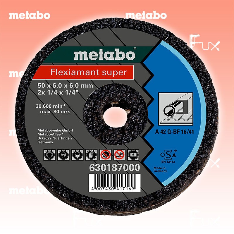 Zu "Kleintrennscheiben " von Metabo Metabo Kleintrennscheiben für Stahl Bestell- und Artikelnummer: 630187000 Korund, Körnung A 24, für Stahl Technische Daten Durchmesser x Dicke x Bohrung 50 x 6 x 6 mm Max. Drehzahl 30600 /min Arbeitshöchstgeschwindigkeit 80 m/s Standard-Ausrüstung Verkaufseinheit 25 Stk. Listenpreis CHF 225.00 Fuxpreis CHF 191.00 inklusive 8.1% MwSt Frankolieferung Kein Grauimport! Produkt bestellen Verkaufseinheit 25 Stk. 1 Stück 2 Stück 3 Stück 4 Stück 5 Stück 6 Stück 7 Stück 8 Stück 9 Stück 10 Stück 11 Stück 12 Stück 13 Stück 14 Stück 15 Stück 16 Stück 17 Stück 18 Stück 19 Stück 20 Stück 21 Stück 22 Stück 23 Stück 24 Stück 25 Stück 26 Stück 27 Stück 28 Stück 29 Stück 30 Stück 31 Stück 32 Stück 33 Stück 34 Stück 35 Stück 36 Stück 37 Stück 38 Stück 39 Stück 40 Stück 41 Stück 42 Stück 43 Stück 44 Stück 45 Stück 46 Stück 47 Stück 48 Stück 49 Stück 50 Stück Alle Angaben ohne Gewähr und solange Vorrat reicht!Wiederverkäufer werden?Lehrlingsrabatt? Produkt als PDF AKTION 15%